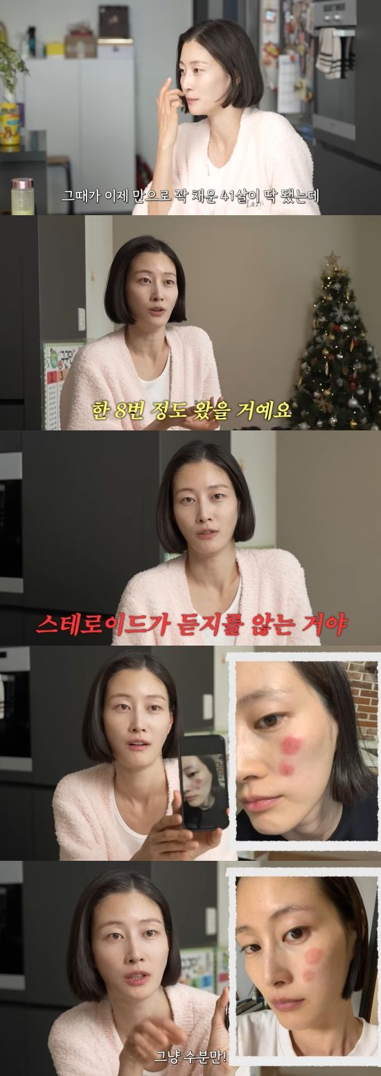 이어 "(다음 사진은) 4개월 정도 지났을 때다. 많이 옅어졌는데 이때 아무것도 안 하고 수분만 챙겼다. 피부염이라고 하더라. 이후에 클렌징 다 끊고 크림으로만 지운다. (예민한 피부를 가진) 제 입장에서는 화장품을 녹이는 게 피부 장벽까지 다 녹이는 거더라. 사진이 12월 달이었으니까 지금 두 달 만에 이렇게 회복한 거다. 스테로이드는 이제 일체 안 먹는다. 왜냐하면 안 듣는다"고 말했다.