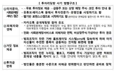 투자리딩방 사기는 대표적인 악성 신종 사기 범죄다. 원금보장·고수익 창출이 가능하다며 전화·문자(SMS)·사회관계망서비스(SNS) 등으로 접근한 후 공개채팅방에 참여하게 유도한다. 이후 바람잡이(가짜 아이디 활용)가 높은 수익을 봤다며 거짓 정보를 지속해서 게시하고 가짜 주식 홈트레이딩 시스템(HTS)을 보여주는 등 다양한 속임수로 피해자를 현혹하여 돈을 편취한다.