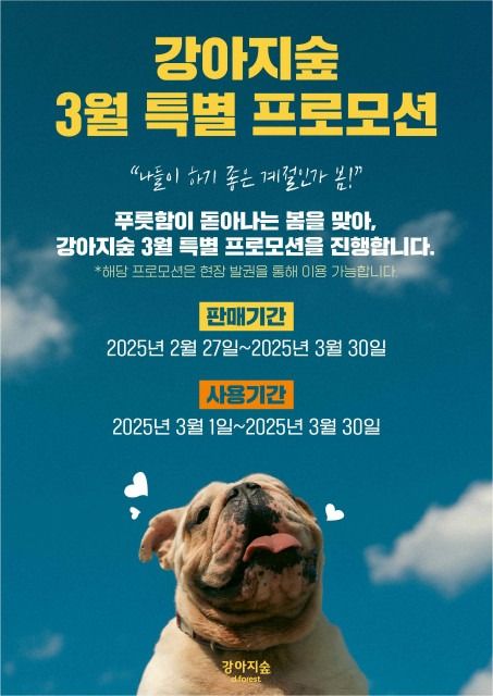 강아지숲은 유난히 추웠던 겨울 기세가 한풀 꺾이고 따스한 기운이 돌면서 이른 봄을 즐기고 싶어 하는 고객 문의가 이어지고 있다며, 이번 프로모션은 야외 활동을 기다려온 반려가족들이 강아지숲에서 봄 추억을 쌓길 바라는 마음에서 준비했다고 밝혔다.