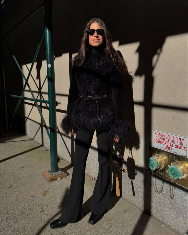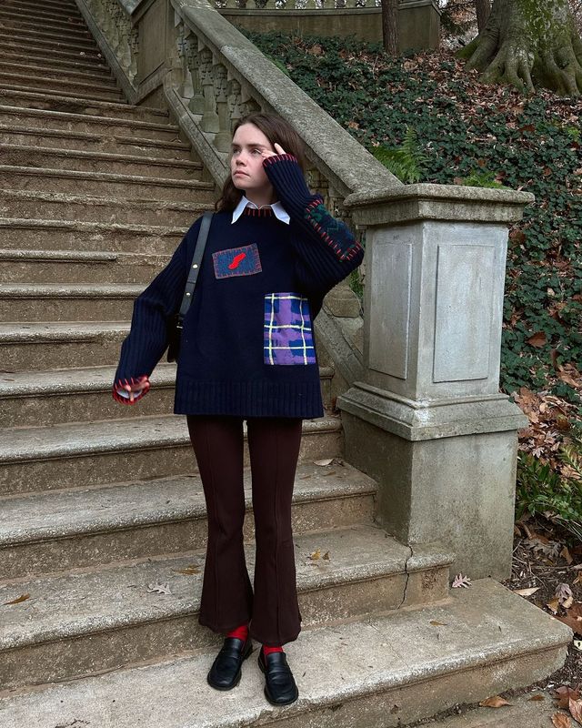 인플루언서 리즈 블러스타인은 빈티지 숍에서 발견한 것 같은 느낌의 브라운 플레어 팬츠를 사랑스러운 그랜마 니트와 함께 착용하였습니다. 다리 라인이 드러나는 타이트한 핏 발목이 드러나는 앙증맞은 길이라 더욱 눈길이 가네요.