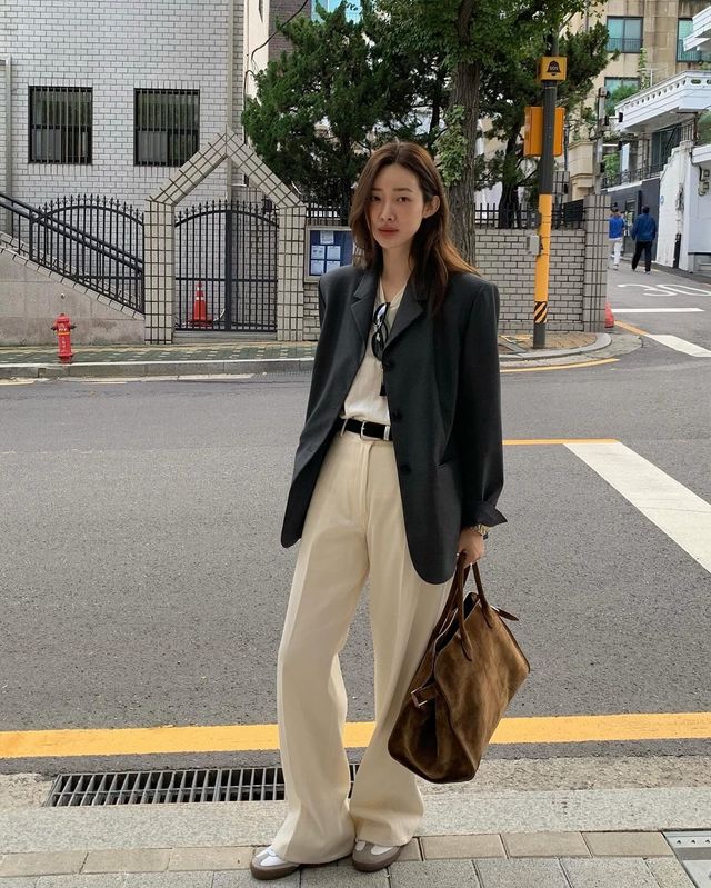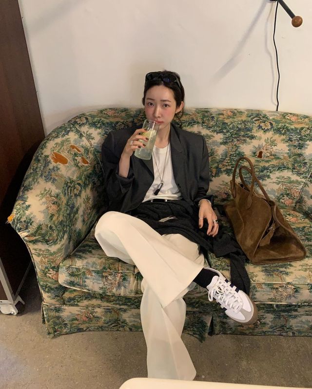 모노 톤을 즐겨 입는 사복 여신 차정원은 화이트 플레어 팬츠를 선택했습니다. 누구의 옷장에나 있을법한 블랙 재킷, 화이트 티셔츠 등 지극히 베이직한 아이템들의 조합이지만 세련된 아웃핏을 연출할 수 있었던 건 자연스럽게 퍼지는 플레어 팬츠 덕분입니다.