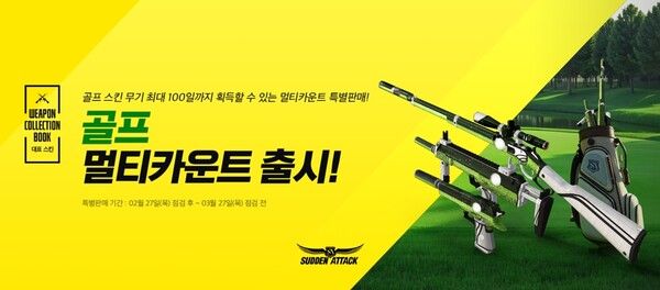 외에도 3월 4일까지 매일 전체 채팅에 정해진 문구를 입력하면 ‘Tiger Stripe Korea’, ‘G18(S) Korea’ 영구제 무기 등의 아이템을 지급한다. 또, 3월 27일까지 ‘골프’ 신규 스킨 무기를 선보이고 이를 기념하는 영구제 무기 획득 이벤트를 진행한다. 멀티 카운트 아이템에서 300일 이상 획득 시 ‘골프 무기 영구제 선택권’과 교환할 수 있으며, 600일 달성 시에는 ‘[M]Hunt 영구제(마이건2)’ 및 2천 SP로 교환할 수 있다.