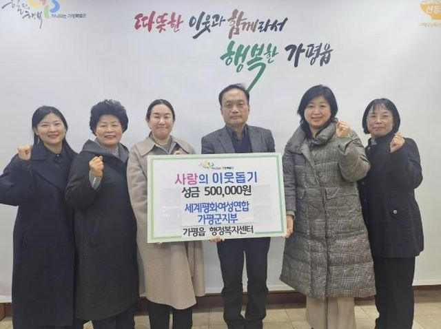 세계평화여성연합 가평군지부는 25일 가평읍 행정복지센터를 방문해 취약계층 지원을 위한 성금 50만 원을 기탁했다.