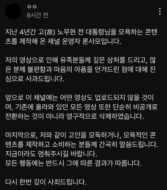 그러면서 “마지막으로 저와 같이 고인을 모독하거나 모욕적인 콘텐츠를 제작하고 소비하는 분들께 간곡히 말씀드린다. 지금이라도 멈춰주시길 바란다. 모든 행동에는 반드시 그에 따른 결과가 따른다”라며 재차 사과했다.
