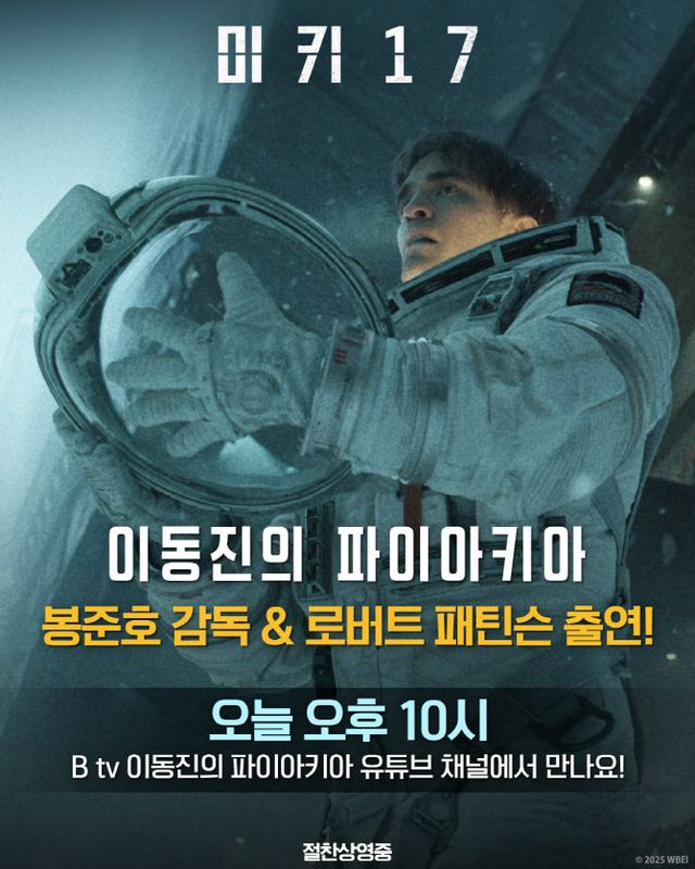 ‘미키 17’은 위험한 일에 투입되는 소모품(익스펜더블)으로, 죽으면 다시 프린트되는 ‘미키’(로버트 패틴슨 분)가 17번째 죽음의 위기를 겪던 중, 그가 죽은 줄 알고 ‘미키 18’이 프린트되면서 벌어지는 예측불허의 이야기를 그리는 영화다. ‘미키 17’의 봉준호 감독과 로버트 패틴슨이 바로 오늘, 28일(금) 개봉과 동시에 유튜브 ‘채널십오야’ ‘나영석의 나불나불’과 ‘이동진의 파이아키아’를 통해 관객들과 만난다.