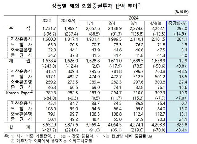 작년 말 기준으로 해외증권투자 중 가장 많은 비중을 차지하는 외국주식이 262억 1000만달러로, 전년대비 293억달러(14.9%) 늘면서 해외증권투자액 증가를 이끌었다.
