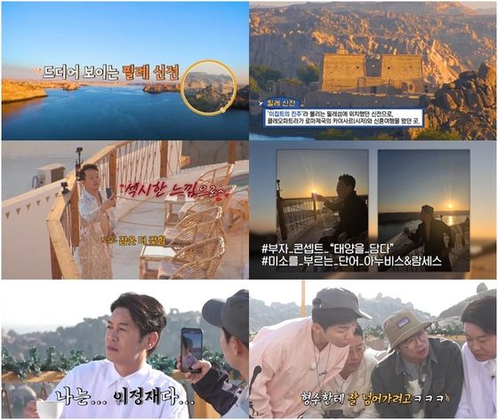 짠내 웃음이 터진‘방 배정 게임’결과에 궁금증이 치솟는 가운데,다음 날 아침 눈을 뜬 김준호는‘필레 신전’뷰를 보기 위해 테라스로 나간다.눈앞에 펼쳐진 나일강과 강 너머로 보이는‘필레 신전’뷰,그리고 아름다운 일출에 감탄한 김준호는“아,예술이다”라며 입을 다물지 못한다.그러더니 곧장 파자마 차림으로 셀카를 찍는다.나아가 그는“여유로운 부자 느낌으로 찍고 싶다”며 유세윤에게 사진 촬영을 부탁한 뒤,파자마 상의를 풀어 헤치는‘파격 노출’투혼(?)으로‘마초 섹시미’를 발산한다.