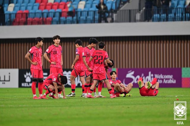 20세 이하(U20) 축구대표팀이 지난달 26일 중국 선전 유스풋볼 트레이닝센터에서 열린 2025 아시아축구연맹(AFC) U20 아시안컵 4강전 사우디아라비아와의 경기에서 승부차기로 진 후 아쉬운 표정을 짓고 있다. 이창원 감독이 이끄는 한국 U20 대표팀은 연장전 포함 120분 동안 득점 없이 비긴 뒤 승부차기에서 2-3으로 졌다. 결승 진출에 실패하면서 13년 만에 우승 꿈도 무산됐다. / 대한축구협회 제공