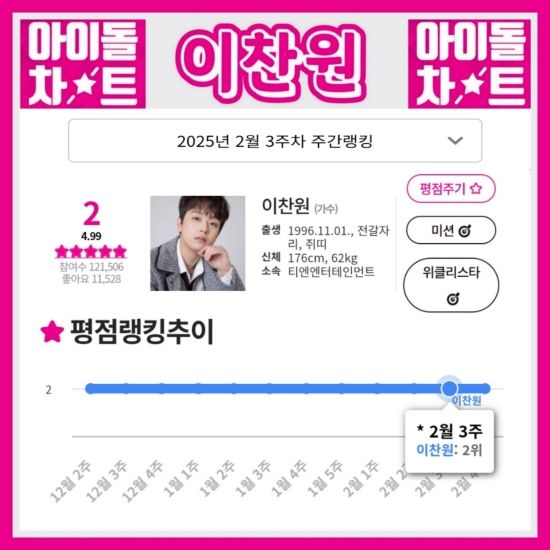 아이돌차트는 최근 이찬원이 2025년 2월 3주 차 평점 랭킹에서 121,506표를 받아 2위를 차지했다고 밝혔다.