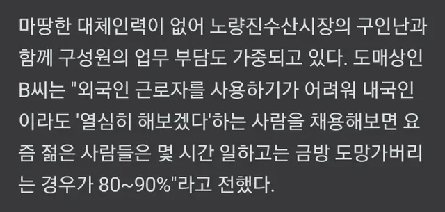 열악한 근무환경과 경악스러운 임금에 외국인들도 전부 도망가는 중이라 인력난이라고 함 ㅋㅋㅋㅋㅋ