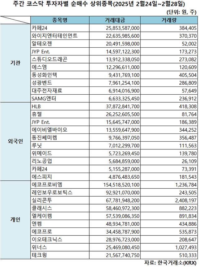기관 '카페24'·외인 'HLB'·개인 '에코프로비엠' 1위 [주간 코스닥 순매수- 2025년 2월24일~2월28일]