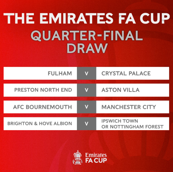 3일(한국시간) FA컵 16강이 종료되고 8강 대진 추첨이 진행됐다. PL 소속인 맨시티, 본머스, 브라이턴앤드호브앨비언, 풀럼, 애스턴빌라, 크리스탈팰리스와 잉글랜드 챔피언십(2부)의 프레스턴노스앤드가 8강에 올랐다. 마지막 자리는 노팅엄포레스트와 입스위치타운의 경기 승자가 진출할 예정이다.