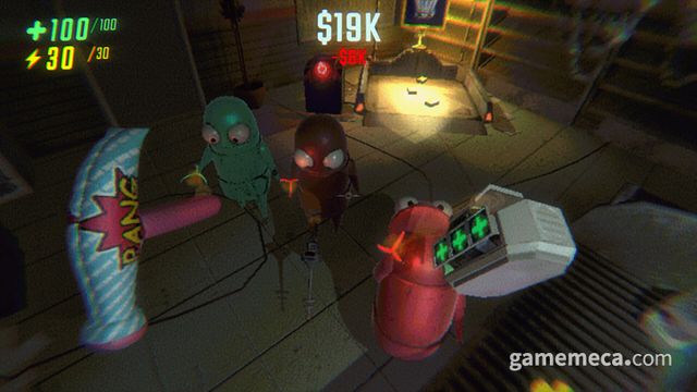 또 하나 독특한 요소로는 패배 아레나가 있습니다. 모두가 스테이지에서 사망해 게임오버가 되면, ‘루저의 아레나’라는 곳에서 배틀 로얄이 펼쳐집니다. 여기에는 몽둥이나 칼 등 근접 무기부터, 무중력 오브, 드론 등 독특한 아이템까지 바닥에 흩어져 있습니다. 이들을 중력 레이저로 들고 함께 게임을 플레이했던 동료들에게 휘두르며 마지막까지 살아남은 ‘패배자의 왕’이 될 수 있습니다.