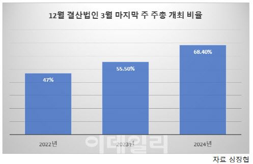 그럼에도 코스피에 상장한 12월 결산법인 가운데 3월 마지막 주에 주총을 개최한 비율은 2022년 47.0%. 2023년 55.5%, 2024년 68.4%로 오히려 증가세를 보인다. 더구나 정부가 ‘밸류업(기업가치 제고)’ 정책을 추진하는 중에도 주총 분산 개최가 제대로 이행되지 않고 있다.