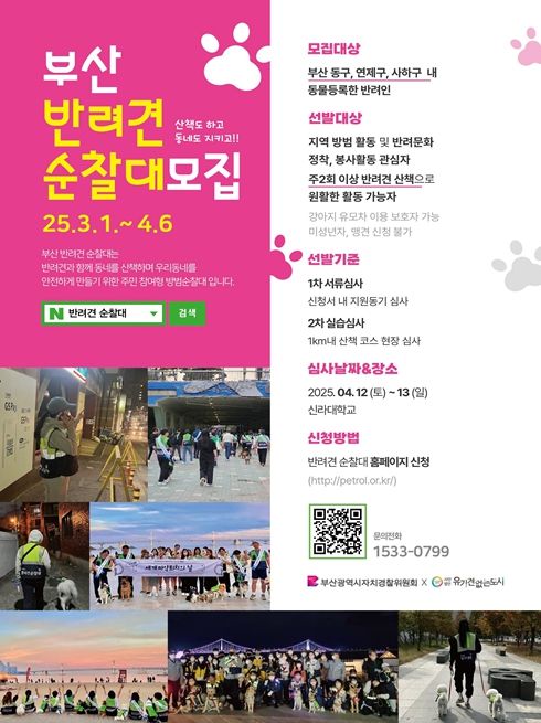 김철준 시 자치경찰위원장은 “'부산 반려견 순찰대'는 시민이 자발적으로 참여하는 지역 치안 활동으로, 시민들이 체감할 수 있는 생활 안전망을 강화하는 데 중요한 역할을 하고 있다. 부산 전역 확대를 목표로 지역 공동체 치안의 모범적인 사례가 될 수 있도록 노력할 것”이라며, “이번 순찰대원 모집에 시민 여러분들의 많은 관심과 적극적인 참여를 부탁드린다”라고 전했다.