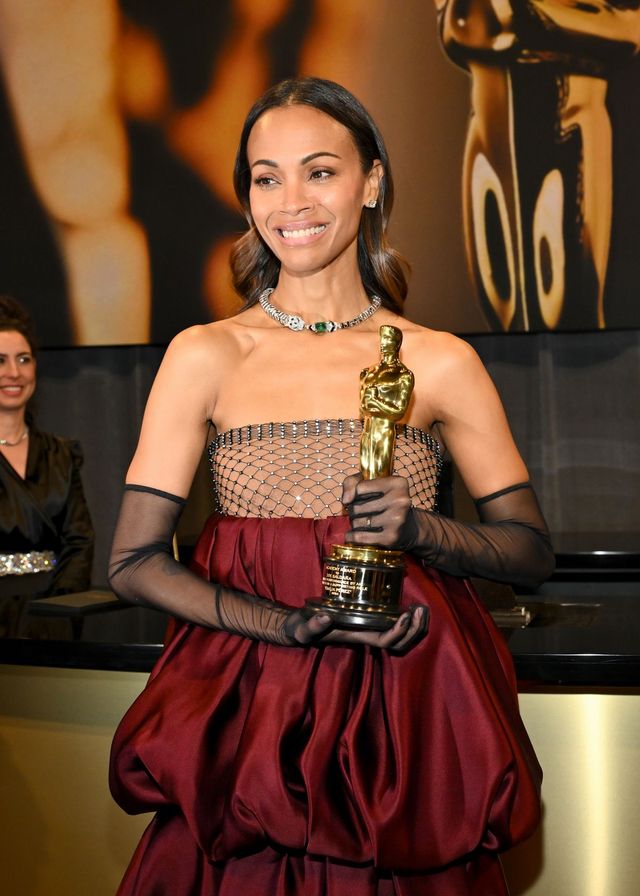 영화 〈에밀리아 페레즈〉로 여우 조연상을 수상한 조 샐다나는 안토니오 바카렐로가 디자인한 생로랑 드레스를 입고 등장했다. 스킨 컬러의 바스트와 삼 단의 층을 이룬 버블 헴 드레스와 볼드한 까르띠에 펜더 네크리스로 시선을 모았다. 제작에만 34개월이 걸린 이 대담한 주얼리는 그녀가 여우 조연상을 수상하면서 더욱 빛났다.