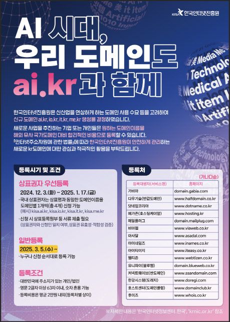 최근 인공지능(AI)을 비롯한 신기술, 신산업이 급속히 발전하면서 정부도 AI 기본법을 제정하는 등 관련 정책을 적극적으로 추진하고 있다. 이번 신규 kr도메인 역시 그 일환으로, 22년 만에 kr도메인을 신설하는 것이다.