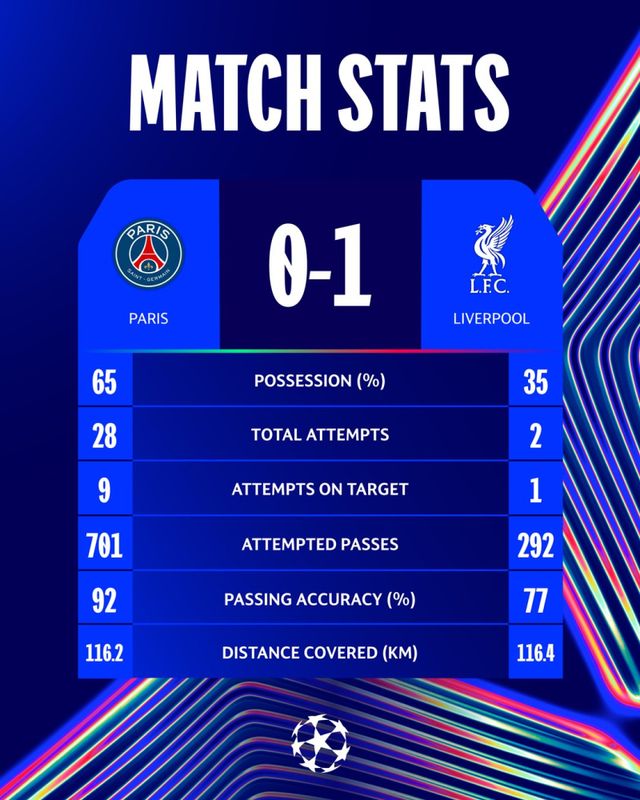 결국 경기는 PSG의 0-1 패배로 끝났다. PSG는 우스만 뎀벨레가 무려 8개, 흐비차 크바라츠헬리아가 5개 슈팅을 시도하는 등 무려 9명이 상대 골문을 위협하고도 9개의 선방을 기록한 알리송을 넘지 못했다.
