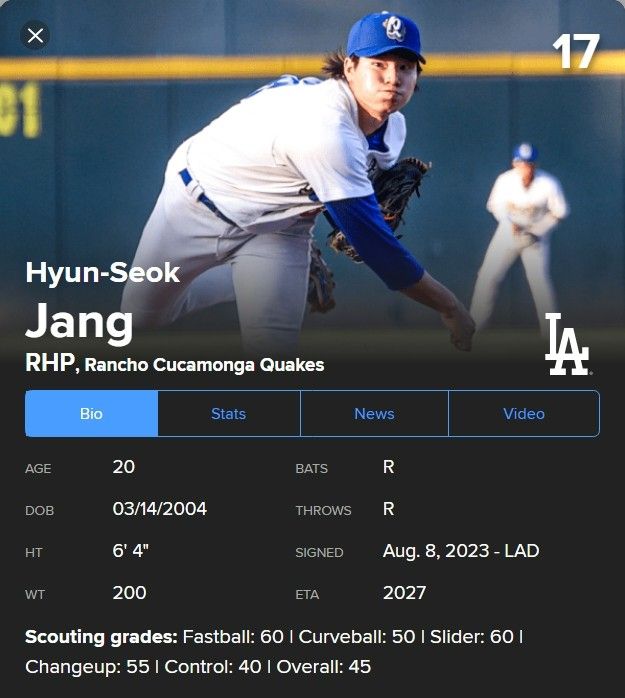 메이저리그(MLB) 공식 홈페이지 MLB닷컴은 6일(한국시간) MLB 각 구단의 팀 내 유망주 순위를 30위까지 정해 발표했다. 오른손 투수인 장현석이 대해서는 다저스 17위, 투수로 한정하면 7위로 평가했다.