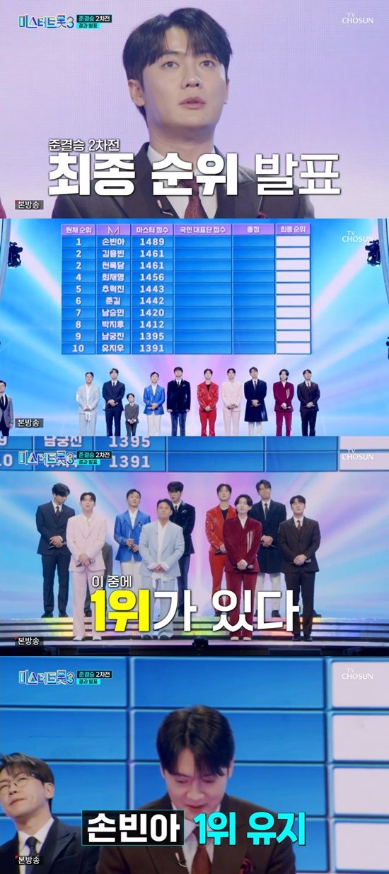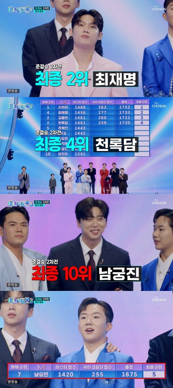 무대를 마친 뒤 받은 마스터 점수대로 발표된 순위에서는 손빈아가 1위, 김용빈과 천록담이 공동 2위, 최재명이 4위를 차지했고, 결승 진출이 가능한 마지막 순위인 7위에는 남승민이 이름을 올렸다.