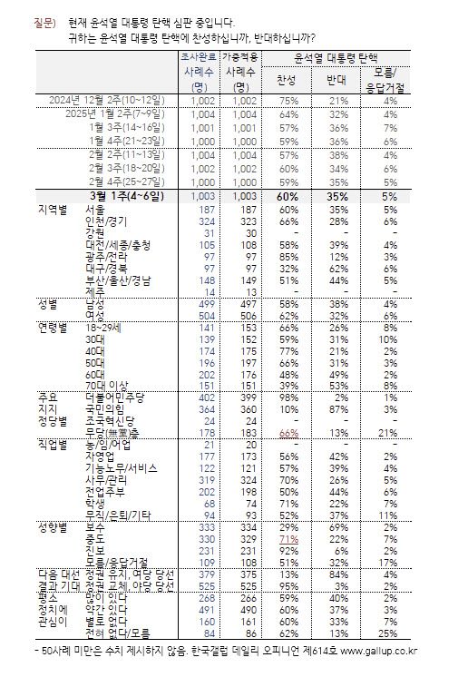 여론조사 전문기관 한국갤럽이 4~6일 실시한 조사에 따르면 윤 대통령 탄핵에 대해 응답자 중 60%가 찬성한다고 답했다. 탄핵을 반대한다는 응답자는 35%였다. 탄핵 반대 비율은 지난주와 같았지만 탄핵 찬성 비율은 1%포인트 증가했다. 중도층에선 탄핵에 찬성한다는 응답자가 71%, 반대한다는 응답자가 22%였다.
