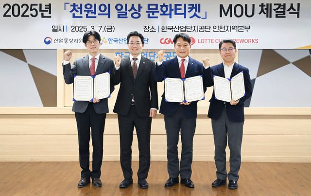 7일 산업통상자원부에 따르면 한국산업단지공단은 이날 인천남동산단에서 박성택 산업부 제1차관이 참여한 가운데 CJ CGV와 롯데컬처웍스와 ‘천원의 일상 문화티켓’ 협약을 맺고 곧 참여 희망 기업의 신청을 받기로 했다.