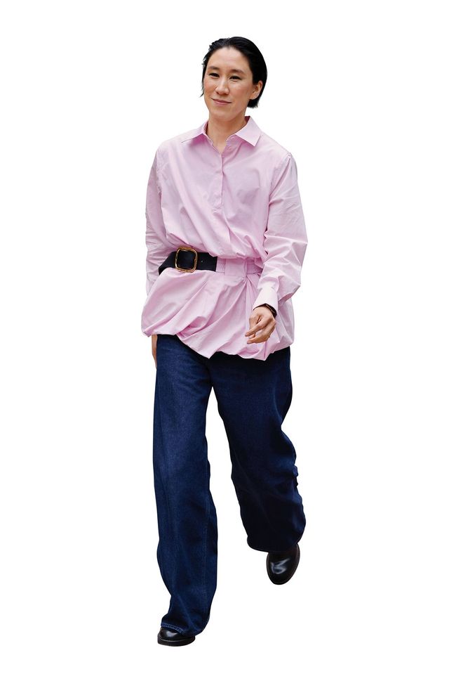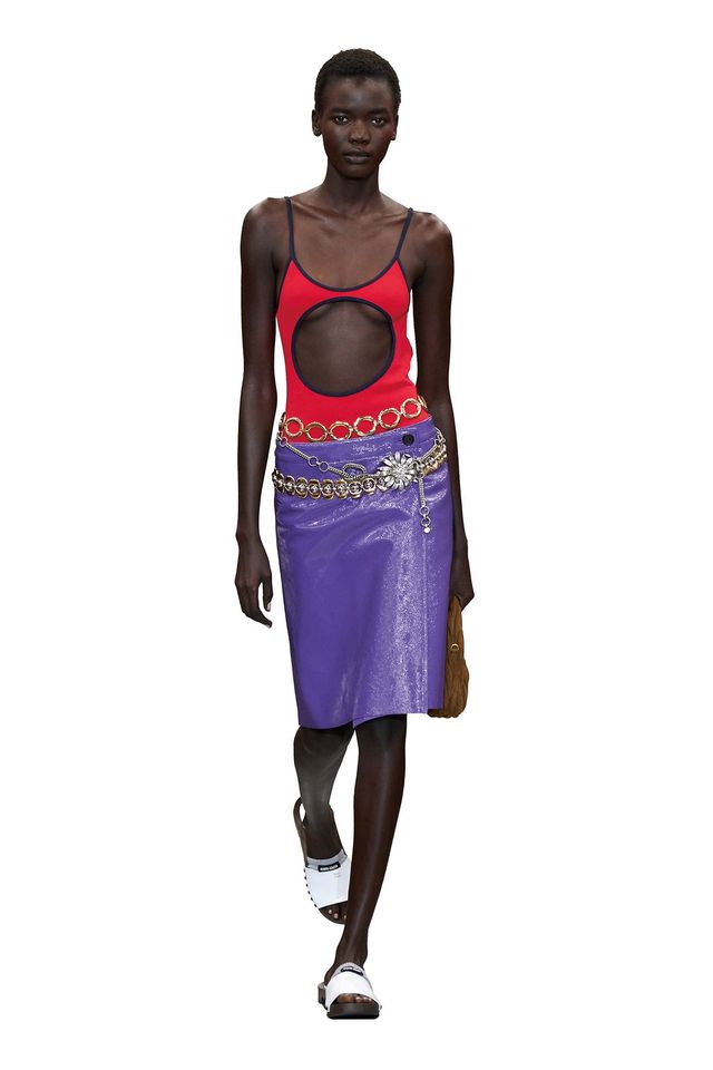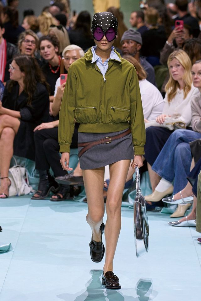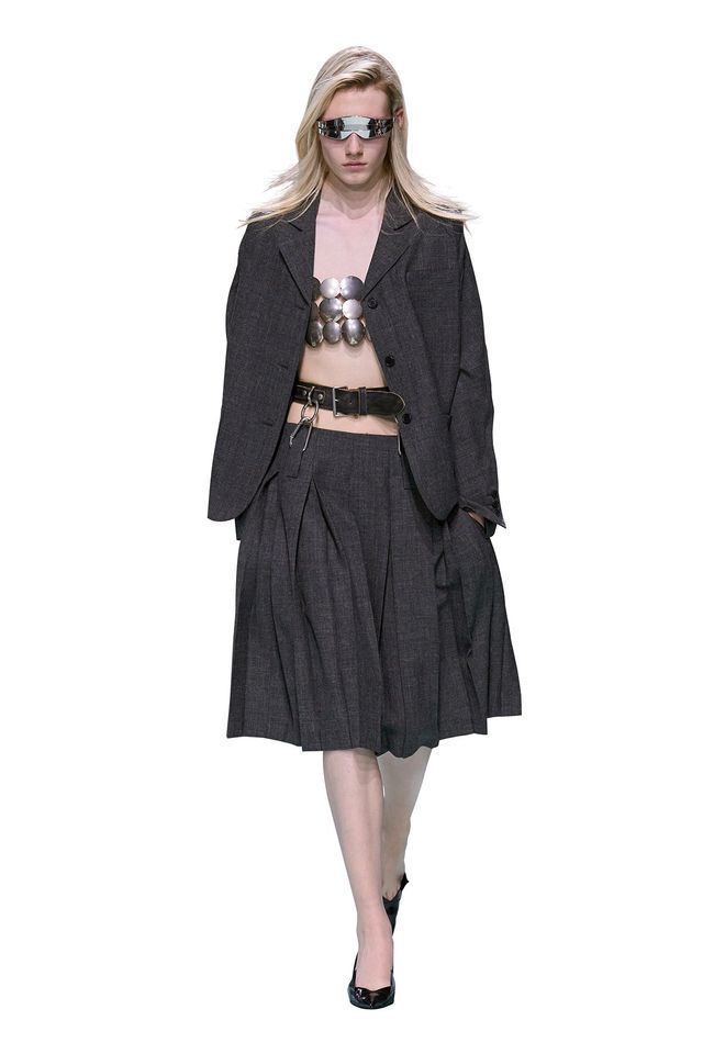 프라다의 2025 봄 컬렉션에서 모델들은 볼드하고 선명한 컬러의 하이웨이스트 레깅스를 입고 나왔는데, 하나같이 허리 라인 한참 밑에 있는 벨트 고리에 연결된 벨트를 차고 있었다. 엉덩이쯤에 걸쳐진 것처럼 보이는 트롱프뢰유(trompe I’oeil) 벨트 장식 스커트와 팬츠를 입은 모델들도 있었다. 또 로 라이즈의 플리츠 울 스커트에는 메탈 링크로 연결된 하이웨이스트 가죽 벨트가 매치되었다. 이를 본 매체들은 즉각적으로 캐리 브래드쇼(〈섹스 앤 더 시티〉의 주인공)가 자신의 복근을 벨트로 강조했던 과거를 떠올렸다. 미우미우는 또 어떤가. 프라다 여사는 벨트를 레이어링 도구로 표현했다. 허리 주위를 감싸는 패브릭과 메탈, 참을 단 것. 이는 지난 두 시즌 동안 그녀의 런웨이를 통해 유명세를 탄 백(벨트 디테일과 개성 있는 참 장식이 달려 있다) 시리즈를 연상시켰다.