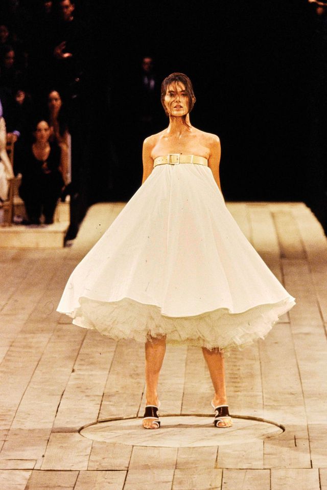 골드 참, 진주, 그리고 가죽 리본이 달린 샤넬의 주얼리와 같은 체인 벨트도 마찬가지. 그런가 하면 알렉산더 맥퀸은 체제 전복적으로 벨트를 사용했다. 1998년 스프레이 총을 든 로봇이 샬롬 할로가 입은 벨트 드레스에 페인팅을 뿌리기도 했으니까. 메종 마틴 마르지엘라는 2006년 가을 오트 쿠튀르 컬렉션에서 벨트로 된 가죽 재킷과 팬츠 컬렉션을 선보인 적도 있다.(H&M과의 디자이너 컬래버레이션에서 다시 만들어지기도.)