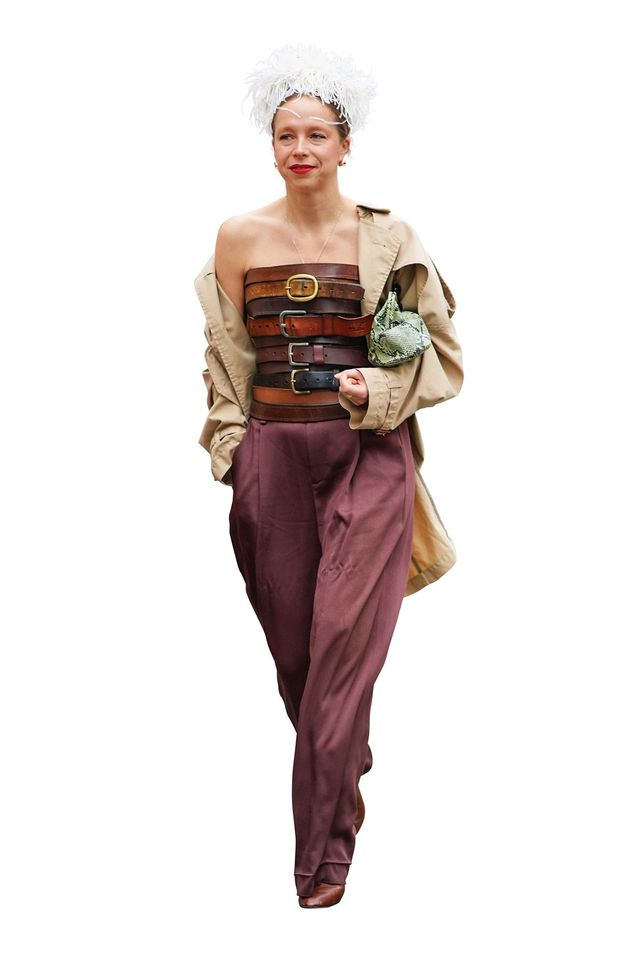 벨트는 런웨이 바깥에서 존재감을 드러내기도 한다. 올리비아 로드리고가 입은 루도빅 드 생 세르넹의 드레스는 마치 빨간 벨트가 뱀처럼 몸을 둘둘 감은 듯 보였다. 벨라 하디드는 뉴욕 길거리를 돌아다닐 때 청바지에 벨트 두 개를 종종 착용하는 것으로 알려져 있다. 그런가 하면 밀라노 패션위크에 나타난, 니먼 마커스의 패션 마켓 & 편집 디렉터를 맡고 있는 클로에 킹(Chloe King)은 어떤가. 그녀가 입은 케이트 헌들리(Kate Hundley)의 톱은 구조적인 가죽 보디스에 부착된 빈티지 벨트로 만들어진 것으로, 시크한 구속복(straitjacket)을 연상시켰다. 그녀는 이 톱에 대해 클래식한 색과 실루엣으로 본디지 아이디어를 비튼 것 같아 마음에 든다고 했다. “대화의 물꼬를 트는 아이템이었어요! 사람들은 대부분 제가 벨트를 몸통 위까지 쌓아 올렸다고 생각했죠. 물론 그렇지 않다고는 말 못하겠지만, 제겐 (이 아이템이) 쓰이길 기다리는 옷장처럼 느껴졌어요. 이 옷은 근사하게 재단됐어요. 이런 약간의 왜곡이 강하고 터프하고 발칙한 느낌을 줄 수 있죠.”
