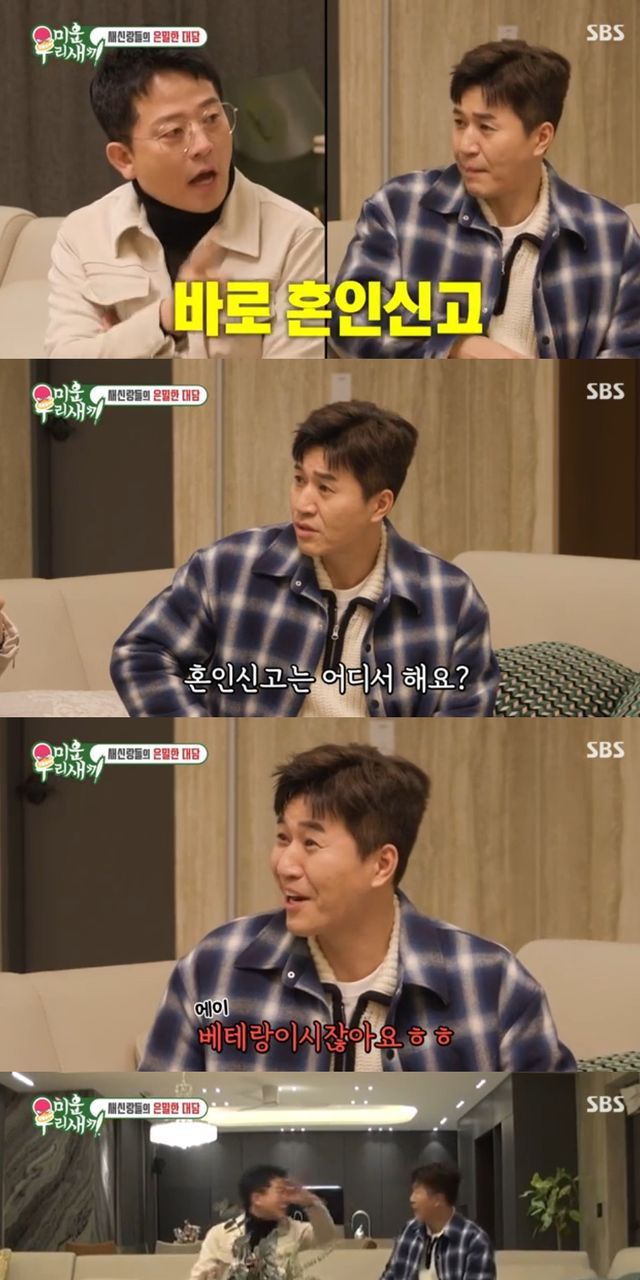 김종민은 "형 근데 혼인신고 어디서 하냐"고 물었고 김준호는 "그걸 왜 나에게 묻냐"며 황당해했다.