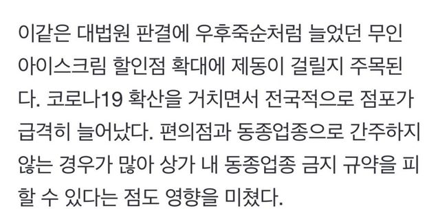 5. 이번 판례가 지금까지 편의점과 동종업종으로 간주하지 않아 우후죽순으로 생긴 무인아이스크림 가게에 제동을 가할 것으로 보임