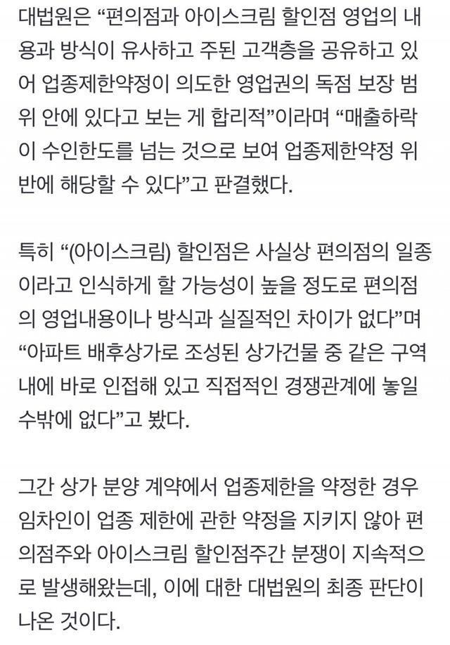 3. 고등법원 “편의점과 아이스크림 할인점은 동종업종 아니잖아. 업종제한 약정 위반 아니야”