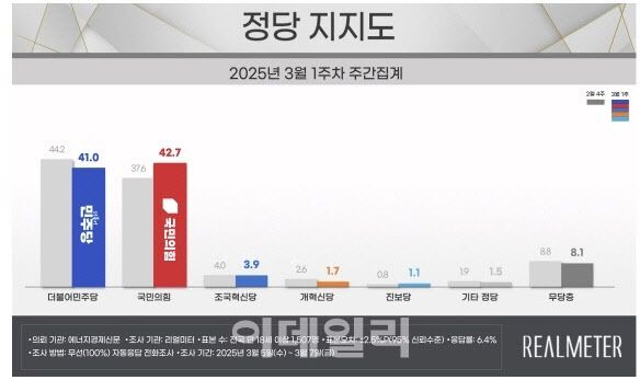 10일 여론조사기관 리얼미터가 에너지경제신문 의뢰로 실시한 3월 1주차 주간 여론조사 결과에 따르면 국민의힘 정당지지도는 42.7%를, 민주당은 41.%를 기록했다. 국민의힘은 전주 대비 5.1%포인트(p) 상승했고 민주당은 3.2%포인트 하락했다. 앞서 지난주 정당 지지율은 민주당이 44.2%, 국민의힘이 37.6%로 민주당이 오차범위 밖에서 6.6% 포인트 우세했다.