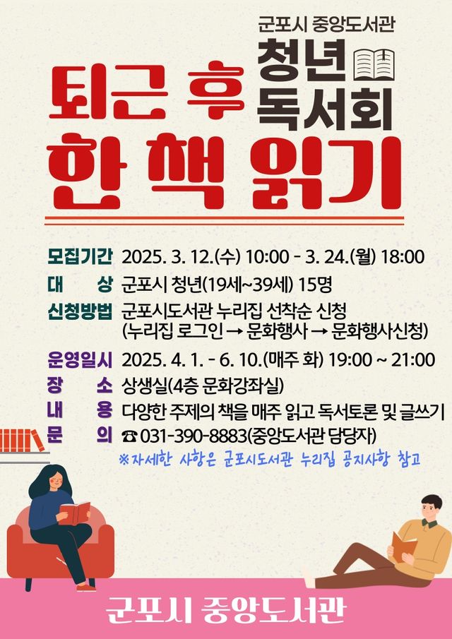 (군포=뉴스영 공경진 기자) 군포시 중앙도서관이, 지역 청년들의 인문교양 증진과 독서문화 활성화를 위해 오는 4월부터 청년독서회 ‘퇴근 후 한 책 읽기’ 프로그램을 운영한다.