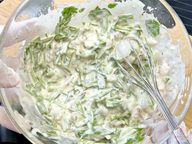 반죽에 미나리랑 새우 넣고 골고루 섞으면 준비 끝!