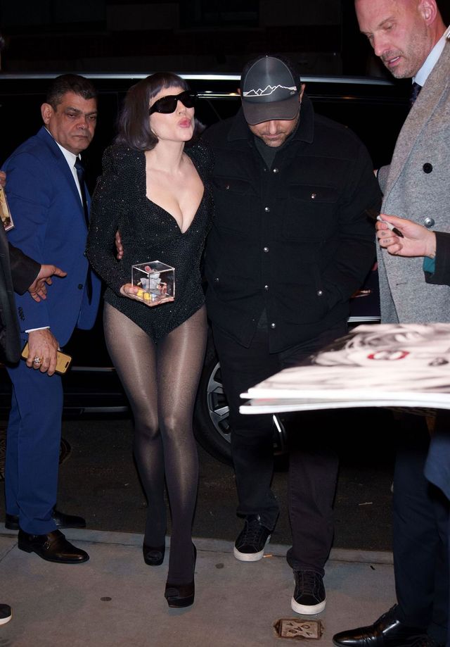 이어진 애프터 파티에서는 당장에라도 퍼포먼스를 펼칠 것만 같은 반짝이는 크리스털 장식 보디 슈트와 스타킹으로 좌중을 압도했습니다. 영화 〈레옹〉의 마틸다를 닮은 뱅 헤어와 볼드한 블랙 선글라스 조합도 역시 가가답네요.