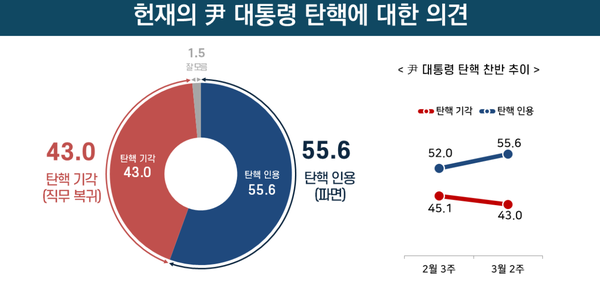 직전 조사에 비해 탄핵 인용 여론은 3.6%P 상승했고, 기각 여론은 2.1%p 하락했다.