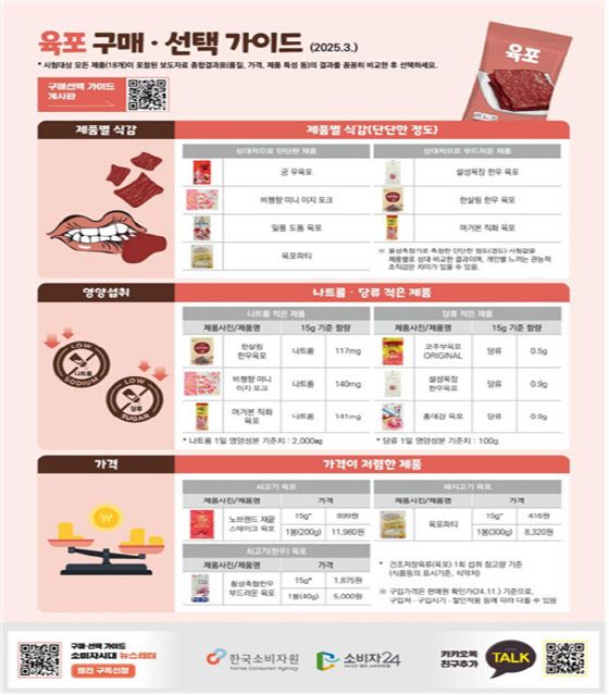한편 육포 1회 섭취량(15g)당 가격은 416원에서 4740원으로, 최대 11.4배 차이가 났다. 소비자원 관계자는 “육포는 나트륨과 당류 함량, 가격이 제품 간 차이가 크고, 섭취와 보관 시에는 곰팡이에 주의해야 한다”며 “다양한 제품에 대한 품질과 안전성 정보를 ‘소비자24’를 통해 제공하겠다”고 말했다.