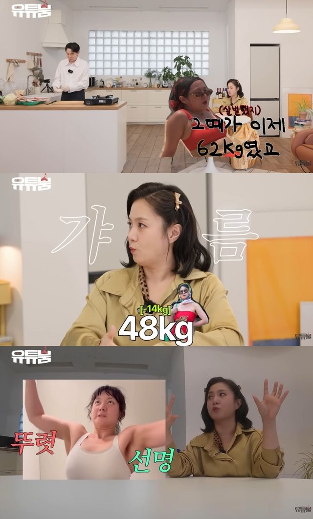그러자 박나래는 "한창 벌크업 됐을 때가 62kg이었고 지금이 48kg"라며 무려 14kg을 감량했다고 밝혀 놀라움을 자아냈다.