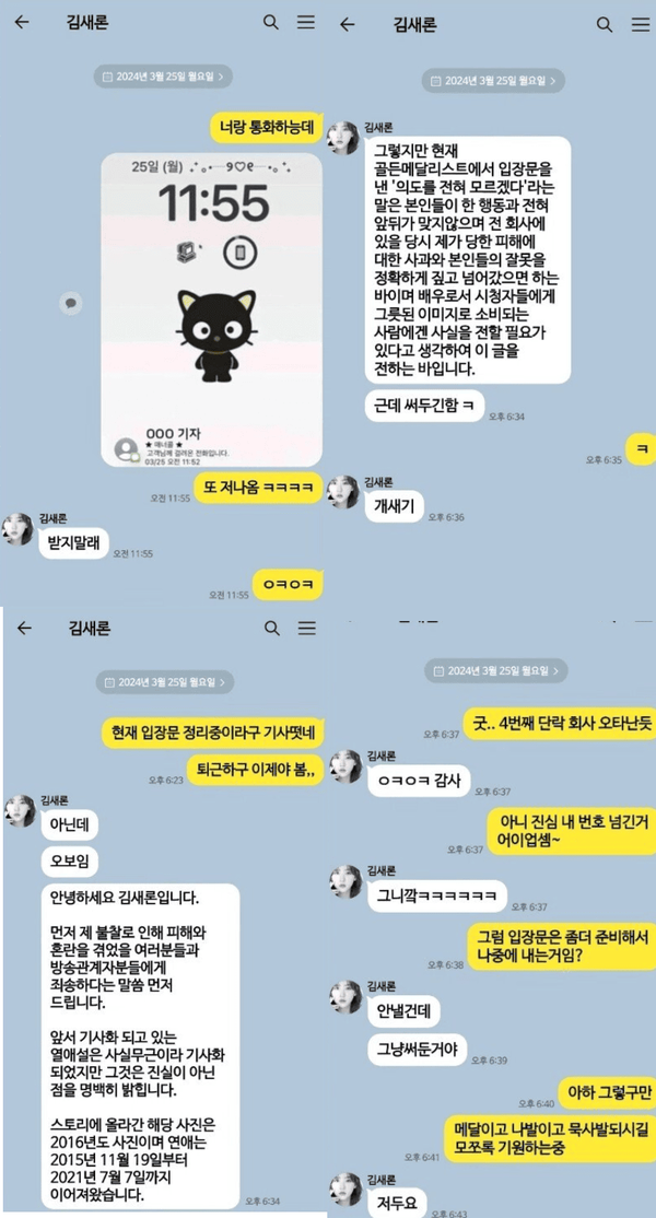 故김새론과 사촌언니의 카톡 대화 내용이 공개되어 눈길을 끌고 있다. 두 사람이 대화 중에도 기자들에게 전화가 걸려왔다는 내용이 담겨있다. 사촌언니는 "현재 입장문 정리중이라고 기사 떴네"라고 말했다. 이에 김새론은 "아닌데 오보임"이라며 자신이 쓴 입장 정리문을 보냈다. 이에 사촌언니는 "그럼 입장문은 조금 더 준비해서 나중에 내는거임?"라고 했고 김새론은 "안 낼건데. 그냥 써둔거야"라고 답했다.