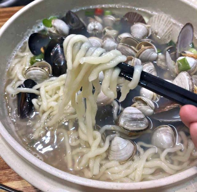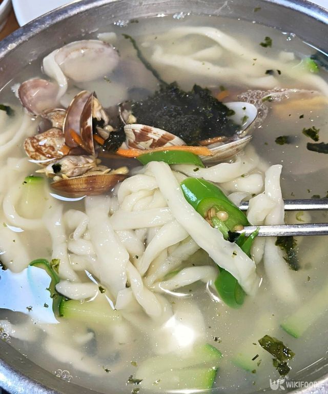 국물은 말 그대로 진국이다. 싱싱한 조개에서 우러나온 깊고 진한 바다의 향이 그대로 담겨 있어, 한 숟갈 뜨는 순간 감칠맛이 폭발한다. 여기에 칼국수 면발이 적당히 퍼지면서도 쫄깃한 식감을 유지해 국물과 환상의 조합을 이룬다.