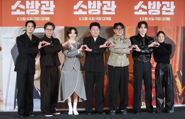 배우 주원(왼쪽부터)과 유재명, 이유영, 김민재, 오대환, 이준혁, 장영남이 2024년 11월 8일 서울 용산구 CGV 용산아이파크몰에서 열린 영화 '소방관'(감독 곽경택) 제작보고회에서 포즈를 취하고 있다. '소방관'은 2001년 홍제동 화재 참사 사건 당시 열악한 환경 속에서도 화재 진압과 전원 구조라는 단 하나의 목표를 가지고 투입된 소방관들의 상황을 그린 작품이다 / 뉴스1
