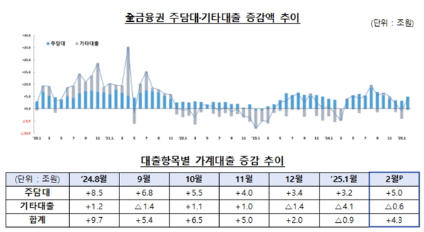 12일 금융위원회의 '2025년 2월중 가계대출 동향(잠정)' 자료에 따르면 전 금융권 가계대출은 지난해 8월 9조7000억원 증가세를 기록한 후 9월 5조4000억원, 10월 6조5000억원, 11월 5조원, 12월 2조원으로 증가폭을 줄여왔다. 올해 1월에는 9000억원 감소세를 보였다.