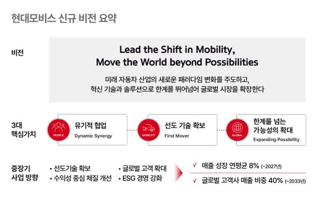 현대모비스의 새 비전은 ‘모빌리티 혁신 선도(Lead the shift in mobility)’, ‘글로벌 고객 확대(Move the world)’, ’한계 없는 성장(Beyond possibilities)’ 세 가지다. 부품산업 퍼스트 무버로서 모빌리티 패러다임을 견인하고, 혁신 기술과 솔루션으로 한계를 뛰어 넘어 글로벌 시장을 확장한다는 목표다.