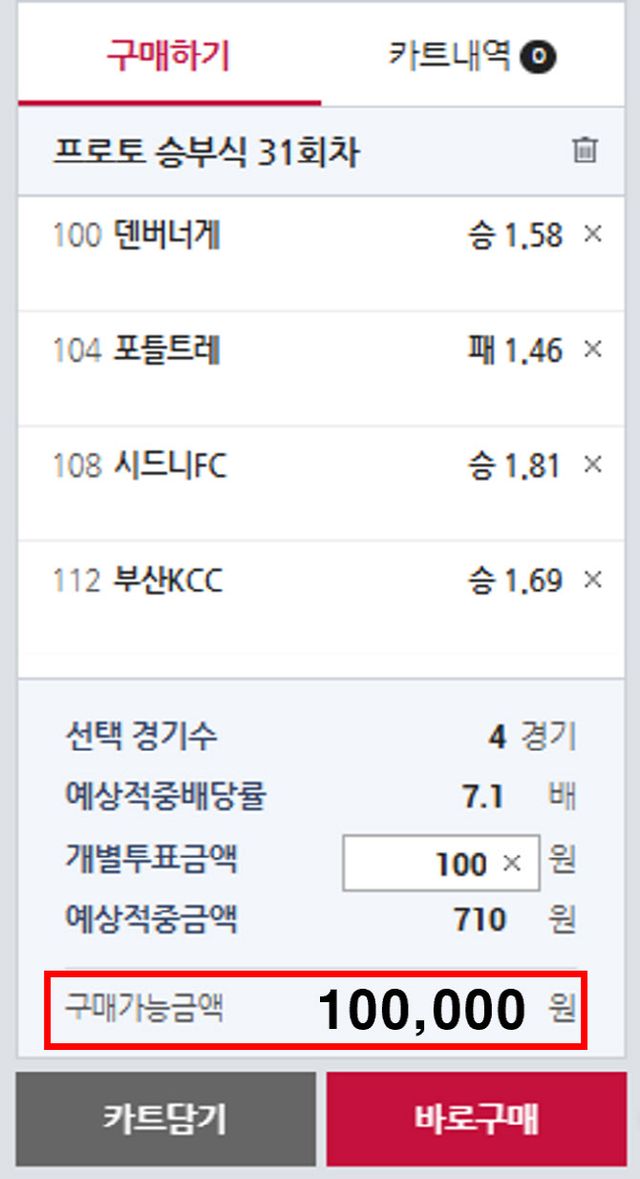 [이데일리 이윤정 기자] 국민체육진흥공단이 발행하는 체육진흥투표권 스포츠토토의 수탁사업자인 스포츠토토코리아는 13일부터 공식 인터넷 발매사이트 ‘베트맨’의 구매한도를 오프라인 판매점과 동일하게 회차당 10만원으로 일원화한다고 밝혔다.