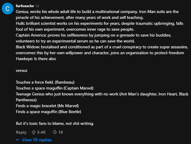 아이언맨: 천재이지만, 본인의 인생 전체를 헌신함. 아이언맨 수트는 단지 멋있는게 다가 아닌