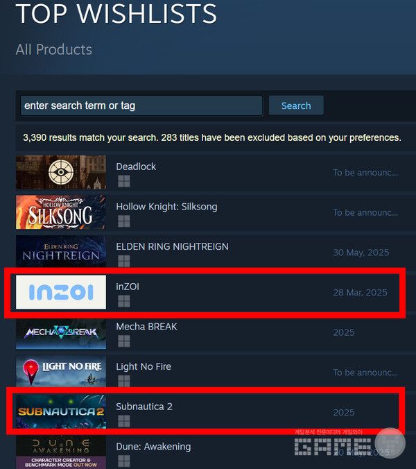Top Wishlists 하위권에서도 한국 게임의 존재감은 여전하다. 시프트업(SHIFT UP)의 스텔라 블레이드(Stellar Blade), 펄어비스(Pearl Abyss)의 붉은사막(Crimson Desert), 넷마블(Netmarble)의 나 혼자만 레벨업: 어라이즈(Solo Leveling: Arise), P의 거짓: 서곡(Lies of P: Overture) 등의 게임이 리스트에 이름을 올렸다.