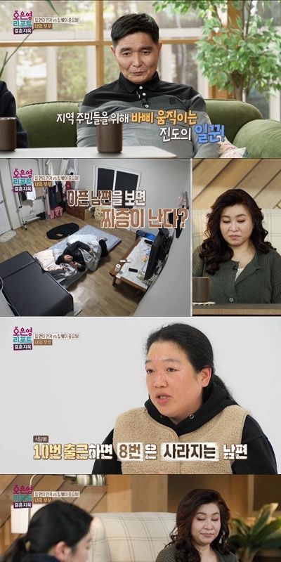 남편은 "저희 마을이 크다 보니 350명 정도가 거주한다. 마을 거주의 상당수가 고령자다 보니 주방장 출신인 주민과 함께 짜장면 봉사, 카네이션 나눔 행사 등을 하고 있다"고 밝혀 모두를 놀라게 했다. 어린이를 위한 주말학교까지 운영했다며 진도를 위해 노력하고 있는 남편에 패널들은 칭찬을 아끼지 않았으나 아내의 표정은 어두워져 눈길을 이끌었다.