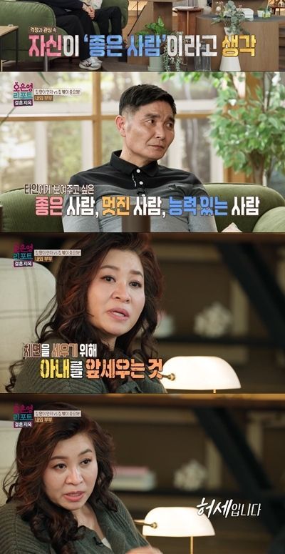 이런 '내외 부부'에 오은영은 "다른 사람에게 체면을 세우기 위해 아내를 앞세우는 거다"며 "정말 나쁘게 표현하면 허세다. 죄송하지만 저는 허세라고 본다"라고 진단했다. 이어 "조금이라도 받아들여서 이 부분을 이해하지 않으시면 두 분의 결혼생활이 정말 진심으로 걱정된다"며 충고했다.