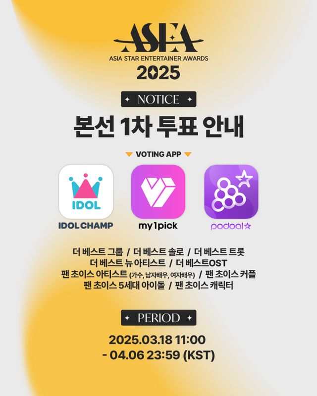 18일 ASEA 조직위원회는 3월 18일 오전 11시부터 4월 6일 0시까지 본투표 1차를 진행한다고 밝혔다. 올해는 수상자 선정에 팬투표 반영 비율을 높인다. 팬들은 이 기간 동안 각 부문별 후보에게 투표, 수상자 선정에 직접 참여할 수 있다.